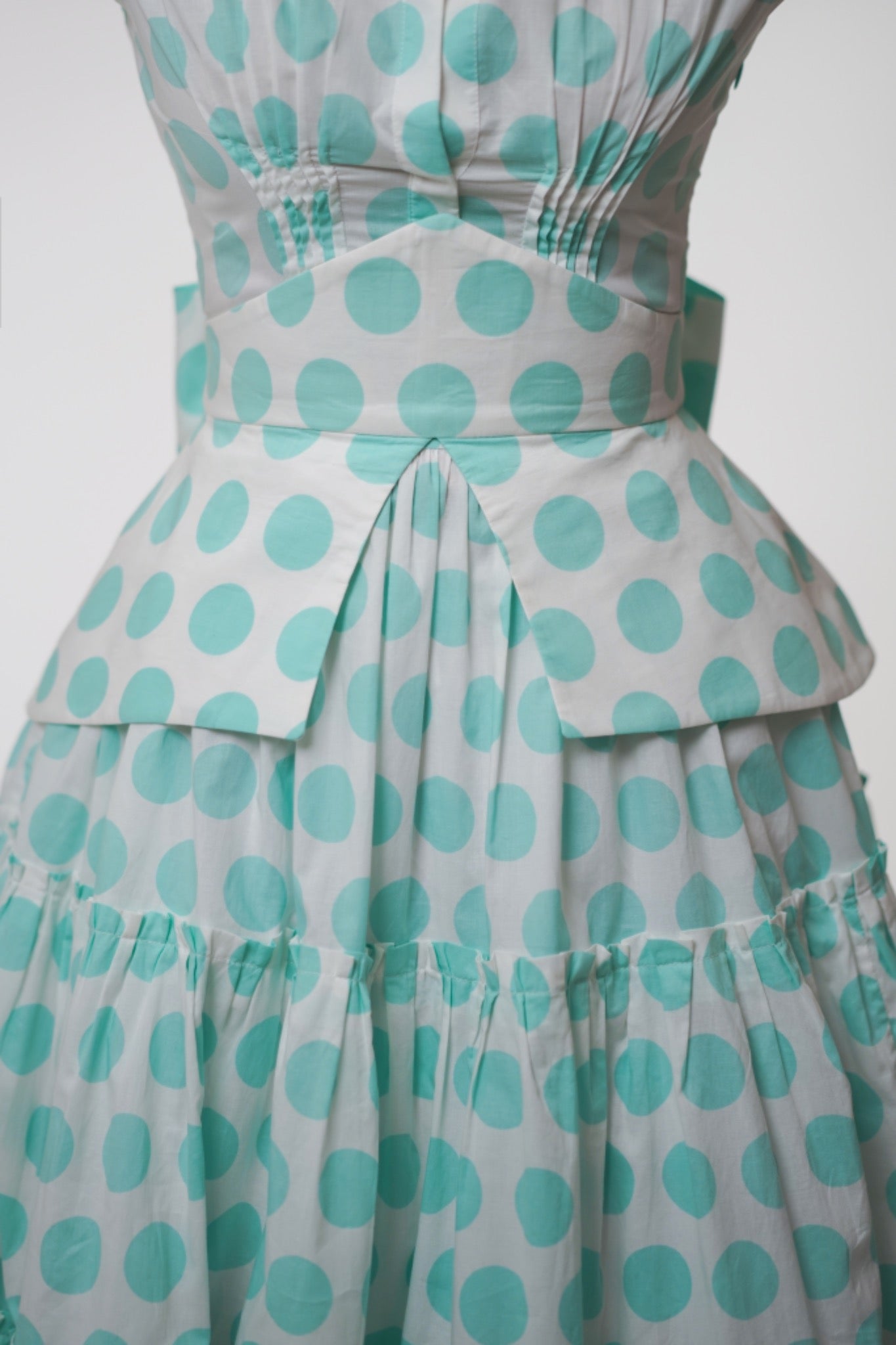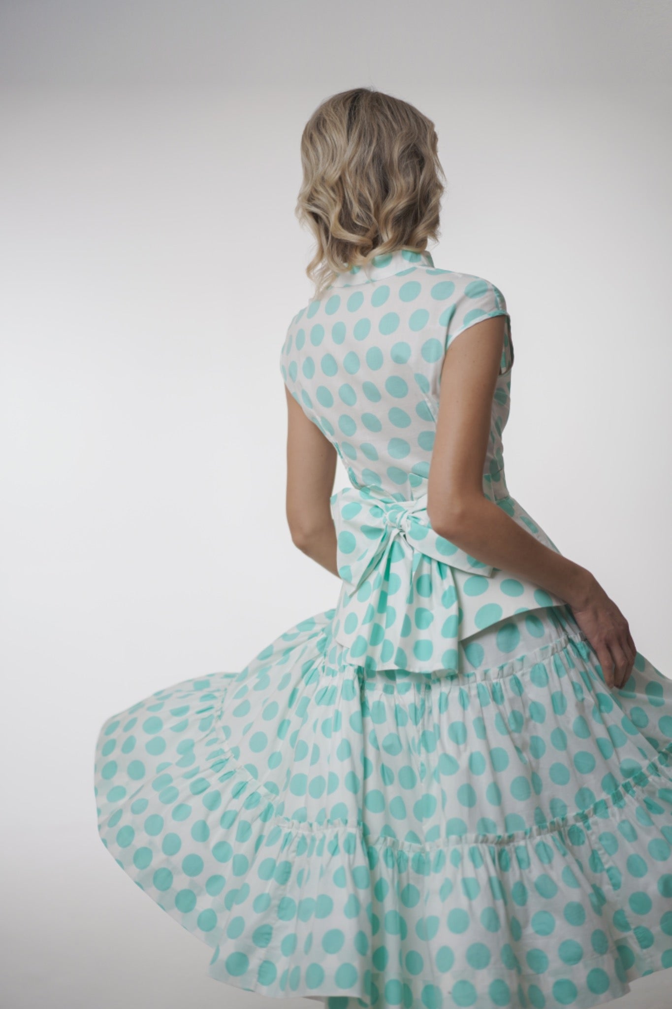 A 1950s-inspired midi dress with a stand-up collar, fitted bodice, and voluminous tiered skirt.