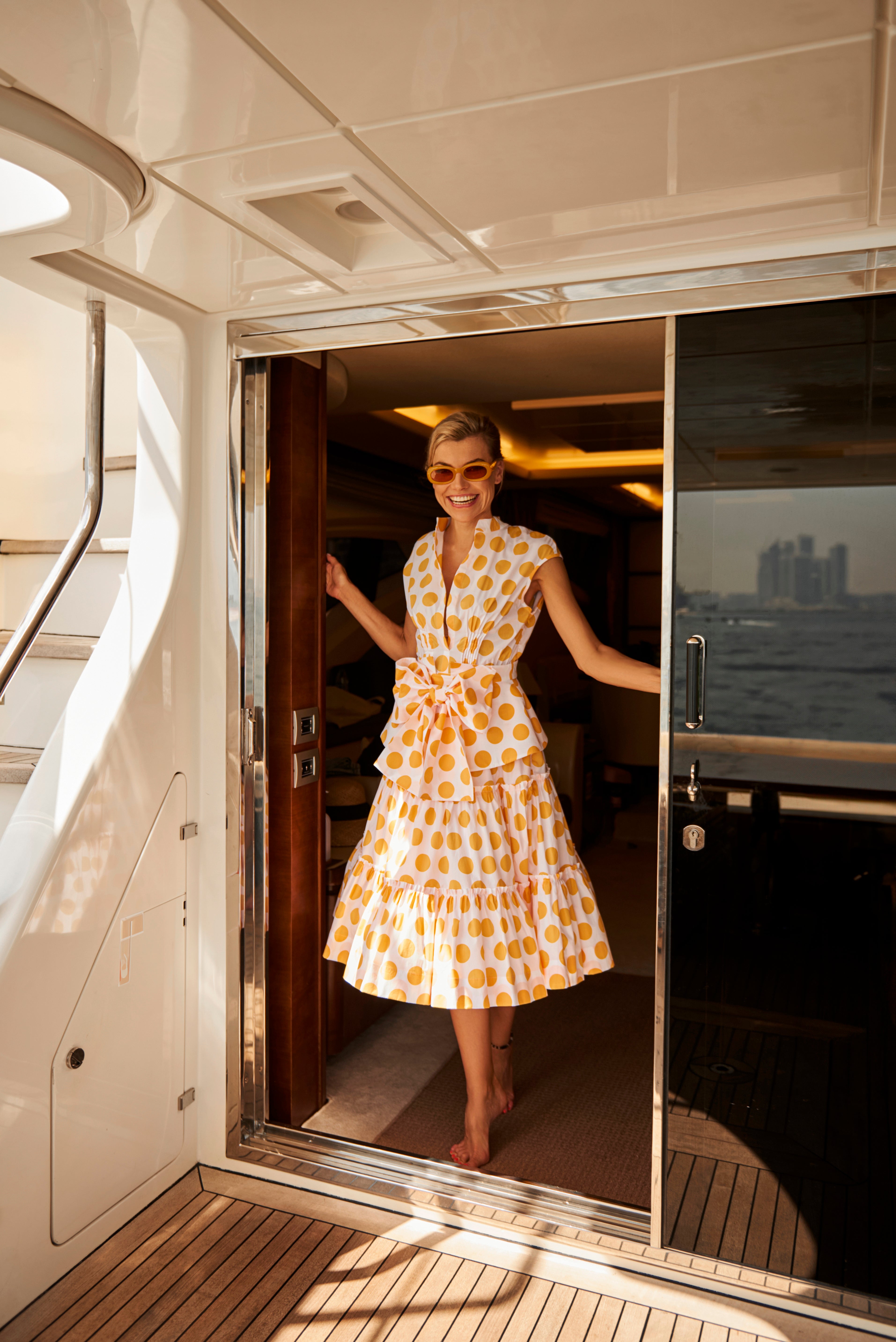 A 1950s-inspired midi dress with a stand-up collar, fitted bodice, and voluminous tiered skirt.