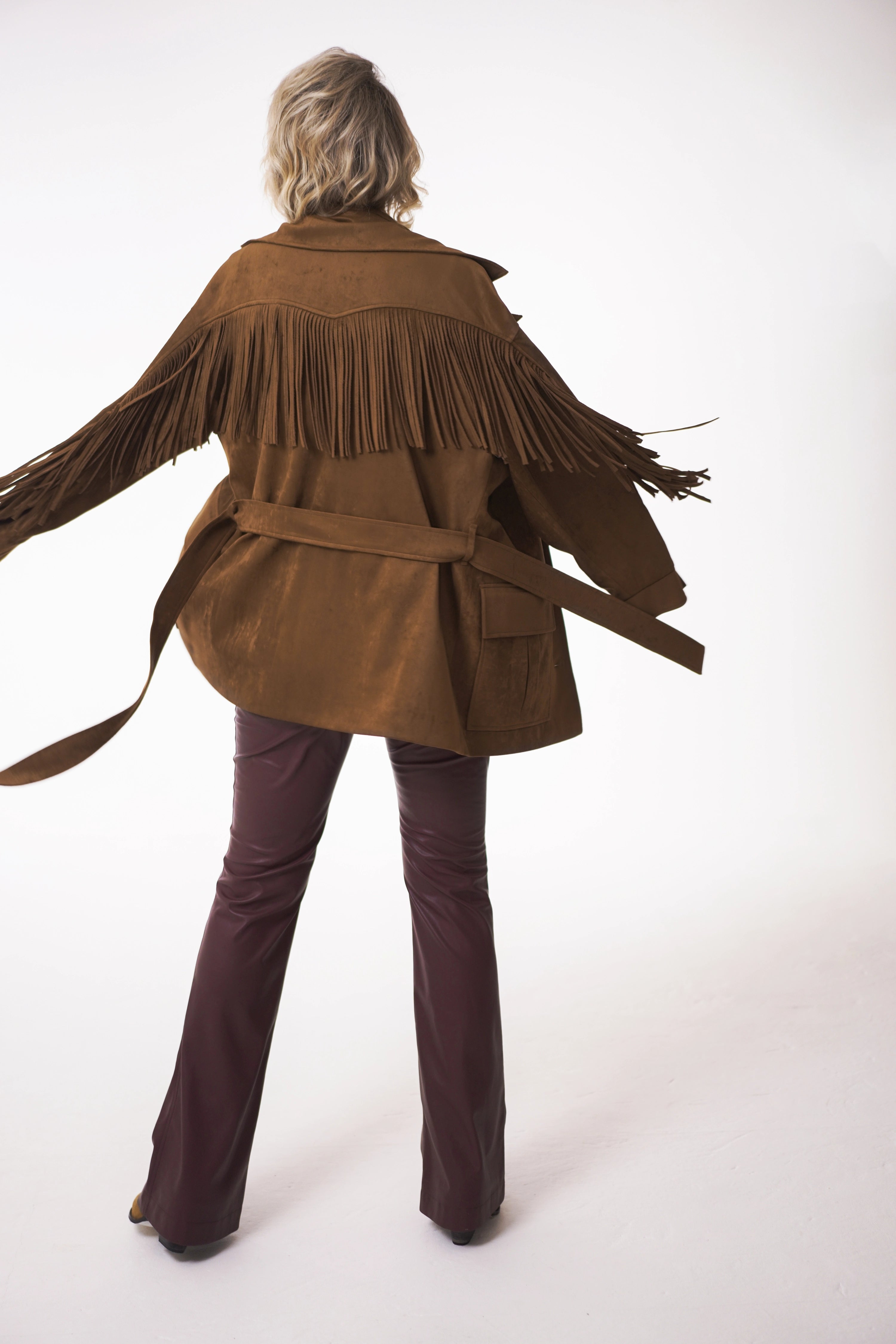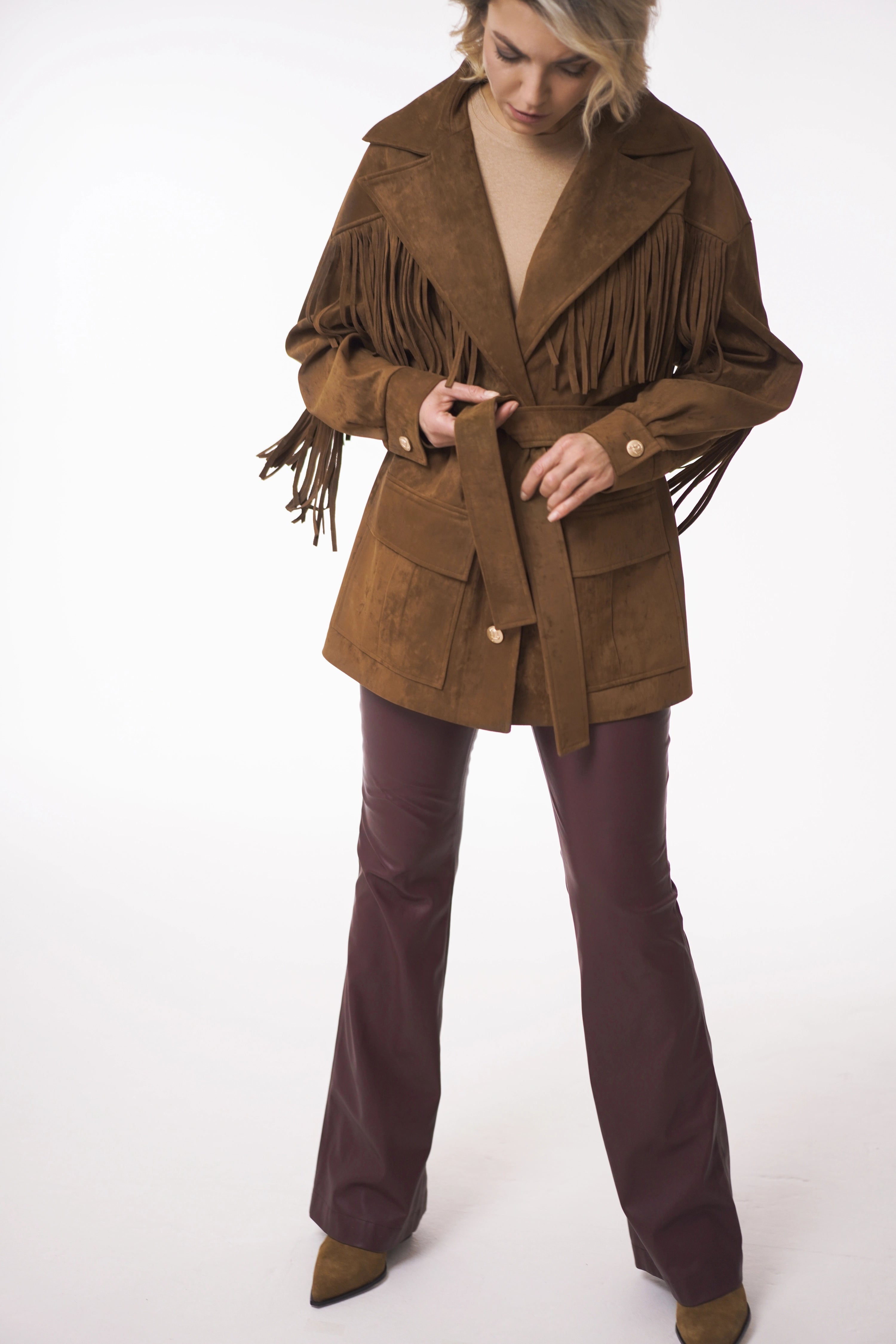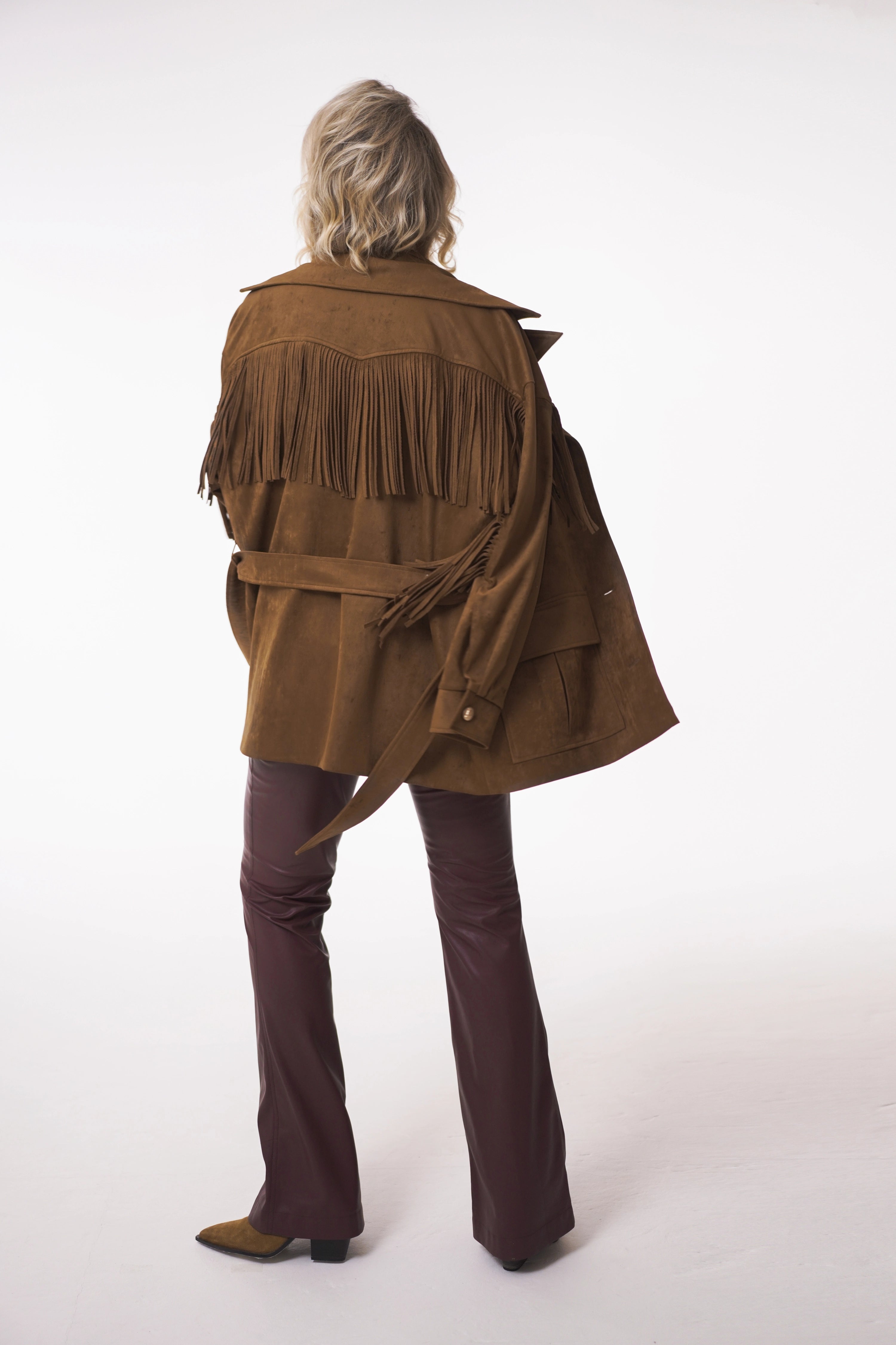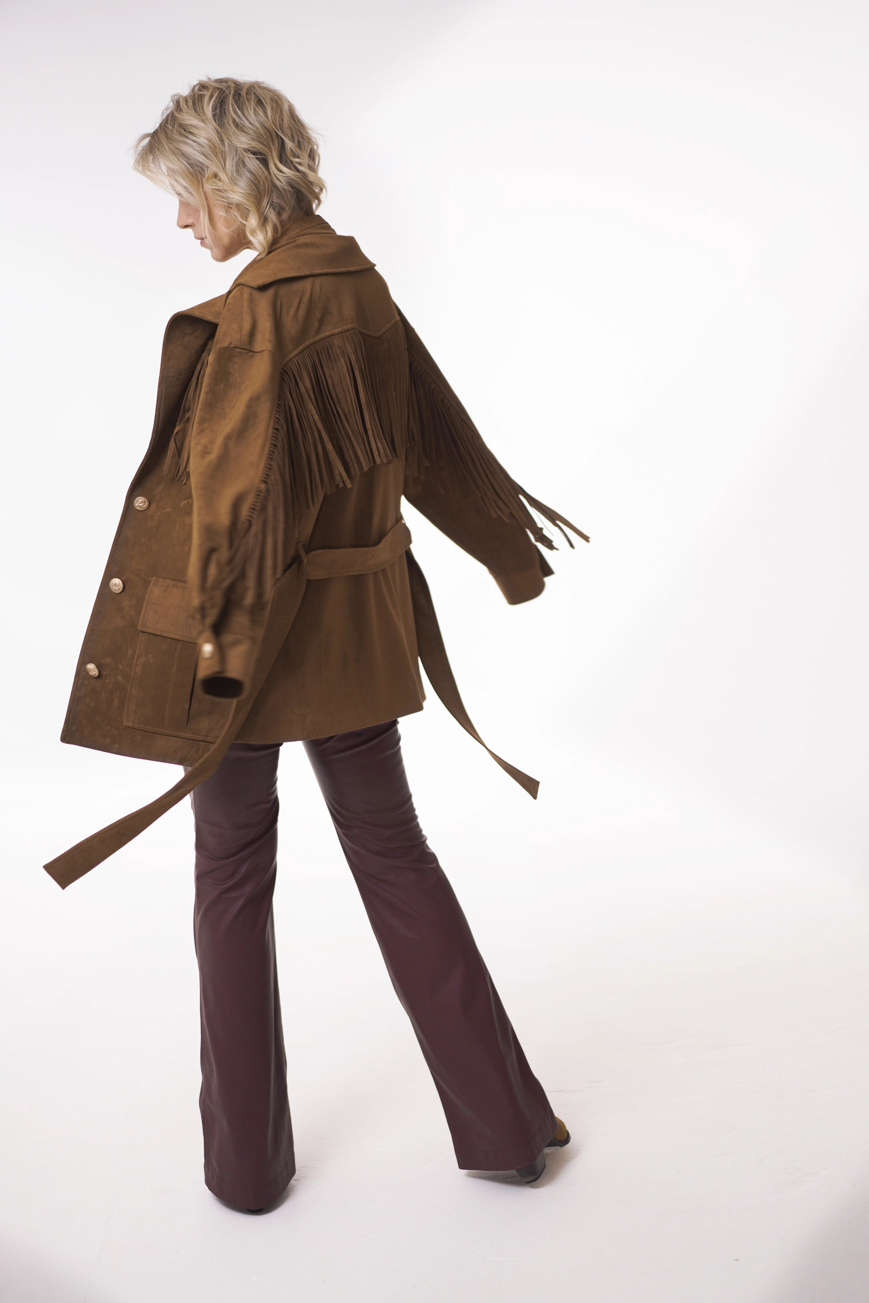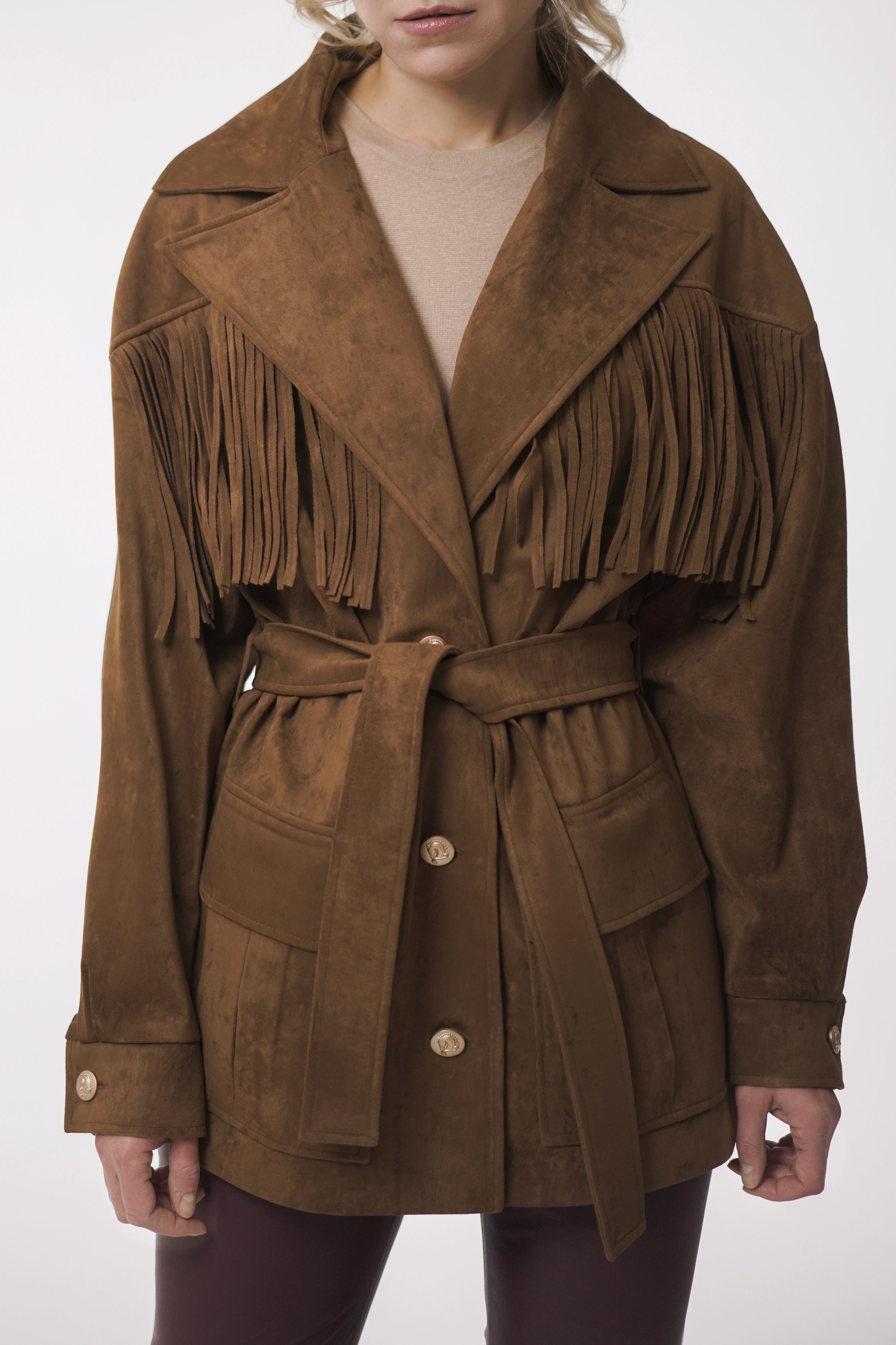 Fringe details flow along the yokes and sleeves, bringing movement and rhythm to every step. A tailored collar with lapels, flap pockets with box pleats, and vintage-inspired metallic buttons add both character and authenticity.