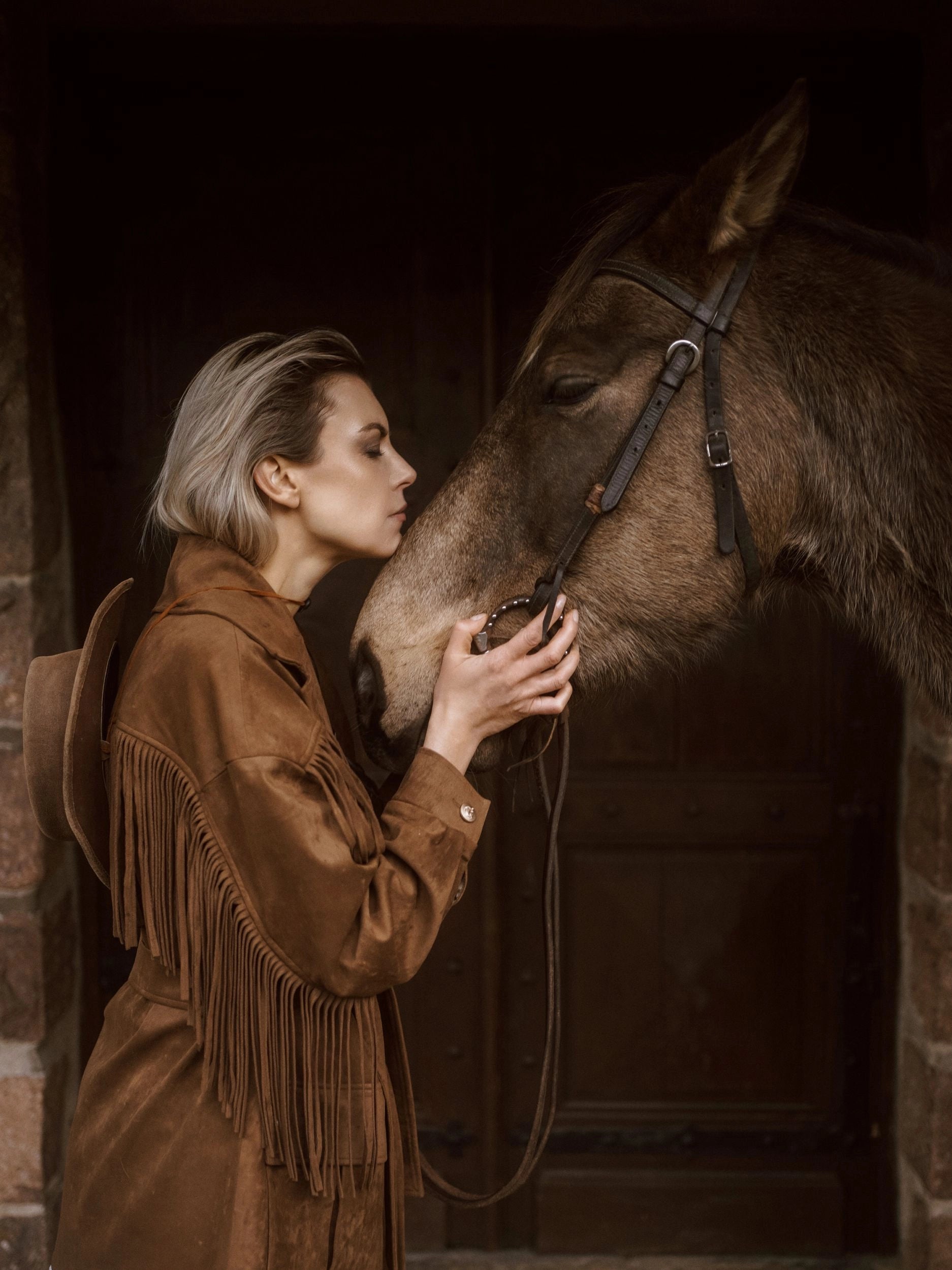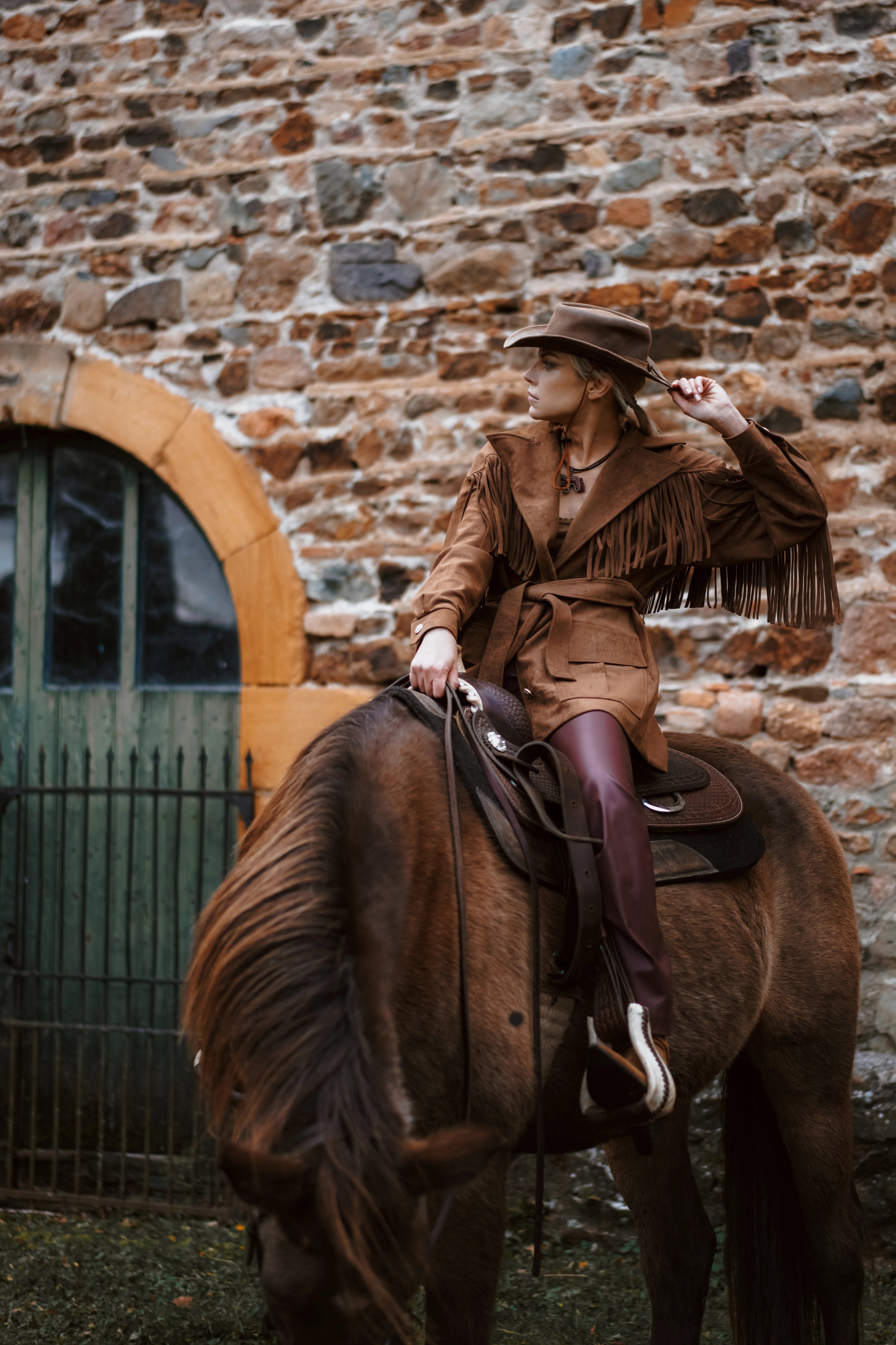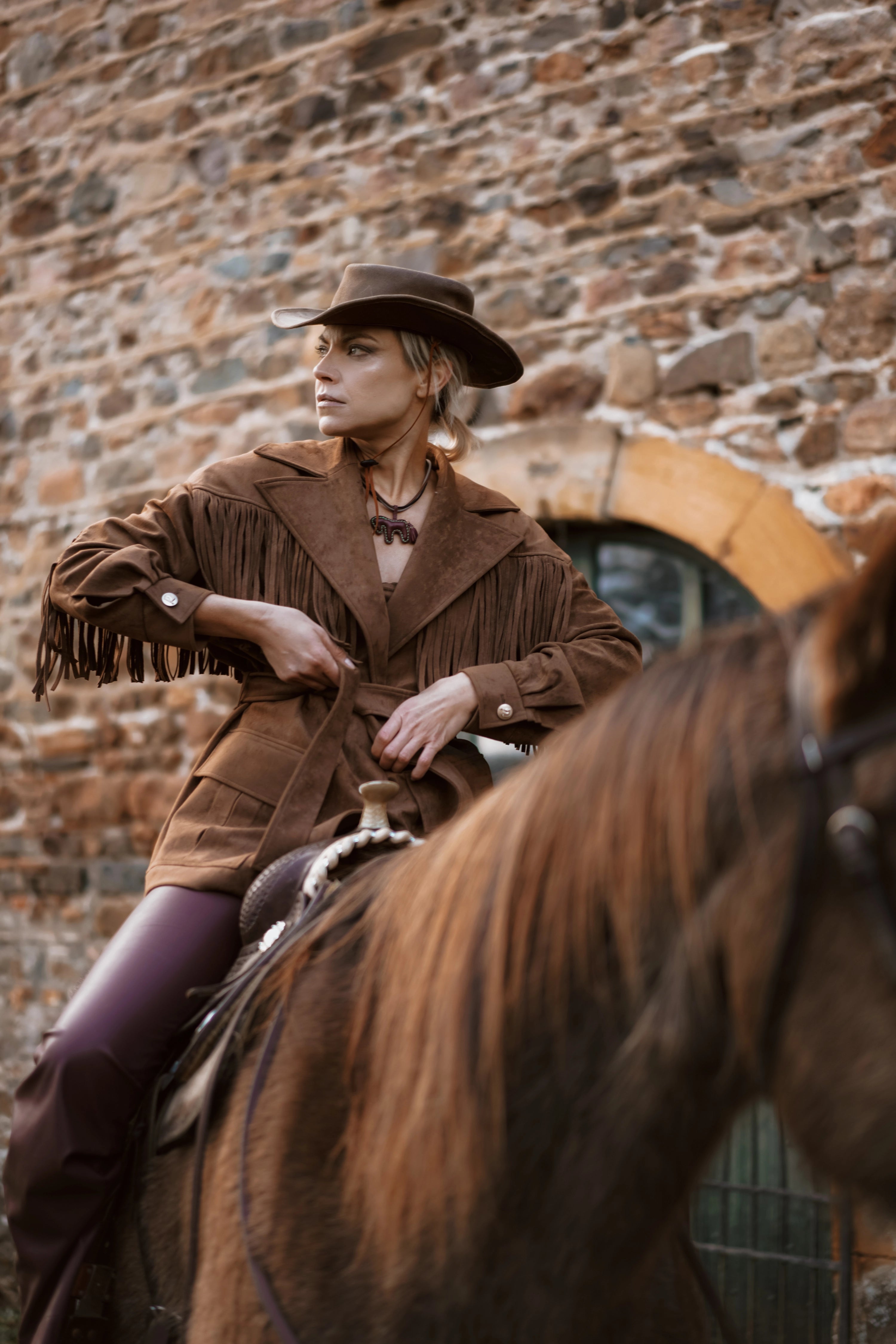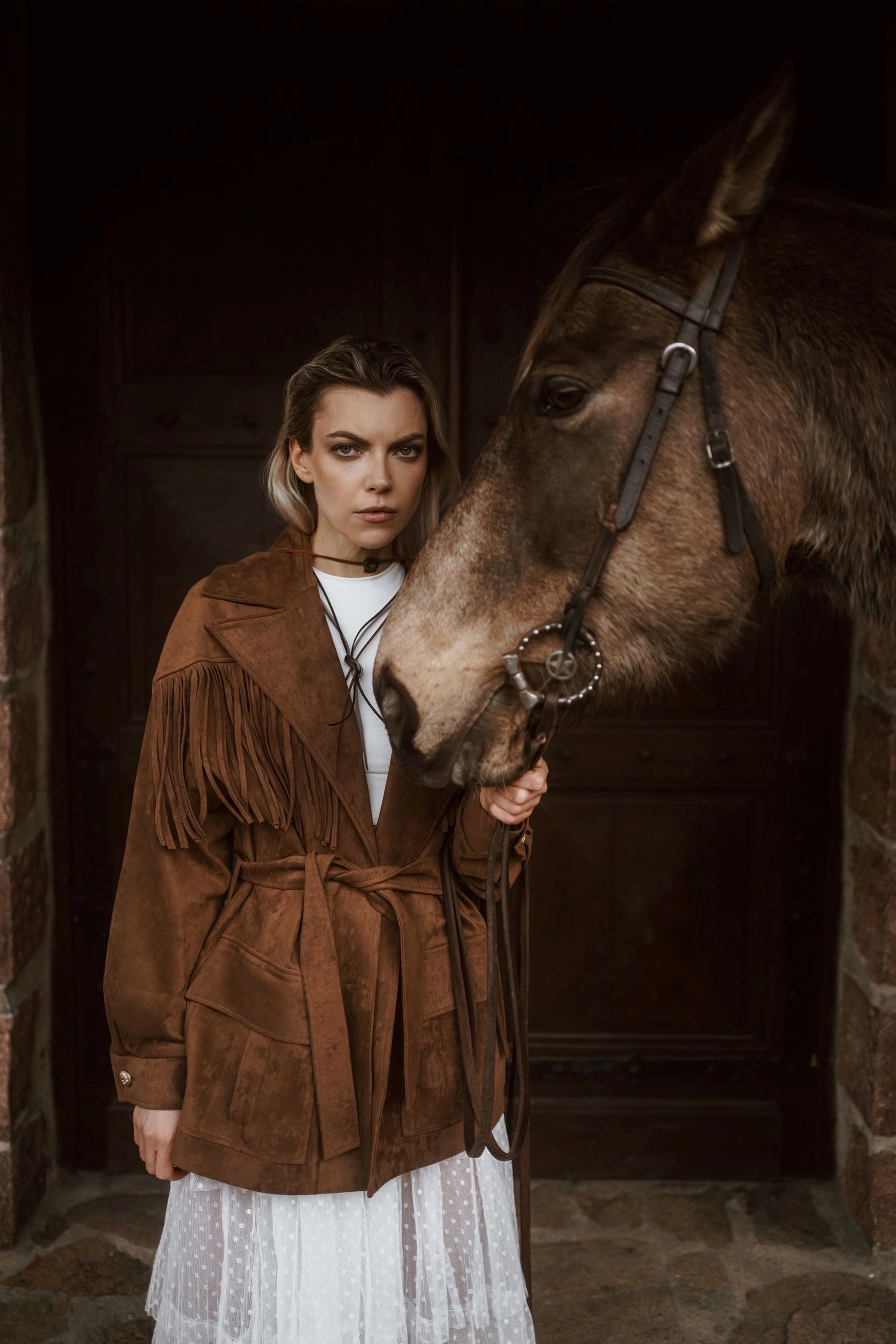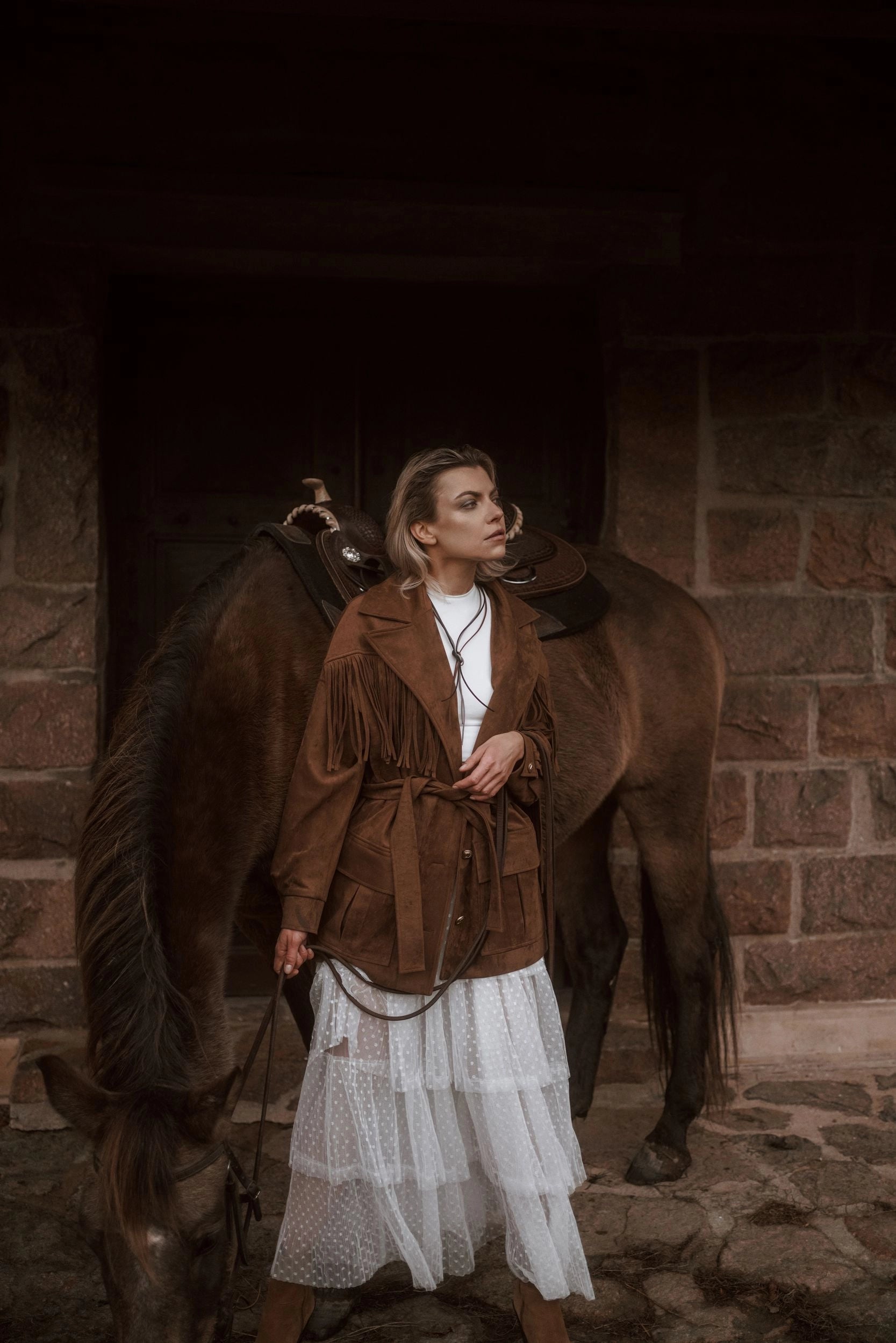 Fringe details flow along the yokes and sleeves, bringing movement and rhythm to every step. A tailored collar with lapels, flap pockets with box pleats, and vintage-inspired metallic buttons add both character and authenticity.