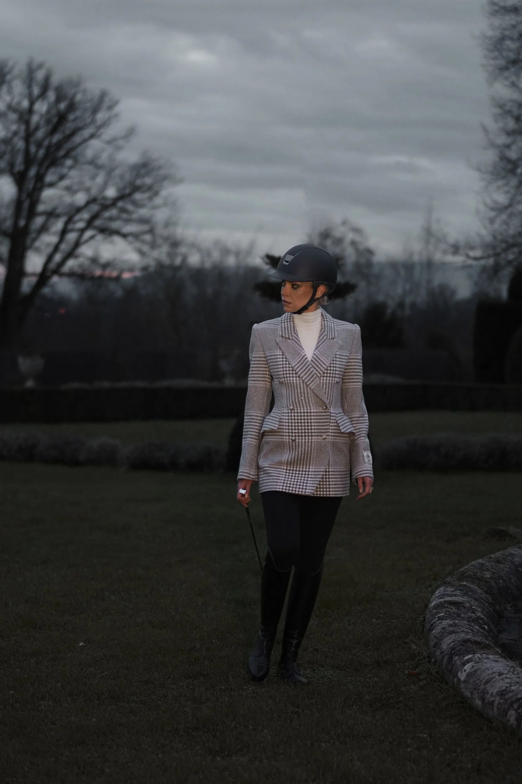 Crafted from refined gray plaid wool, the silhouette is sculpted yet soft, drawing on aristocratic codes with contemporary sharpness. Vintage French silver-tone buttons from the 1930s enrich the piece with discreet depth — an echo of history, reborn for today.