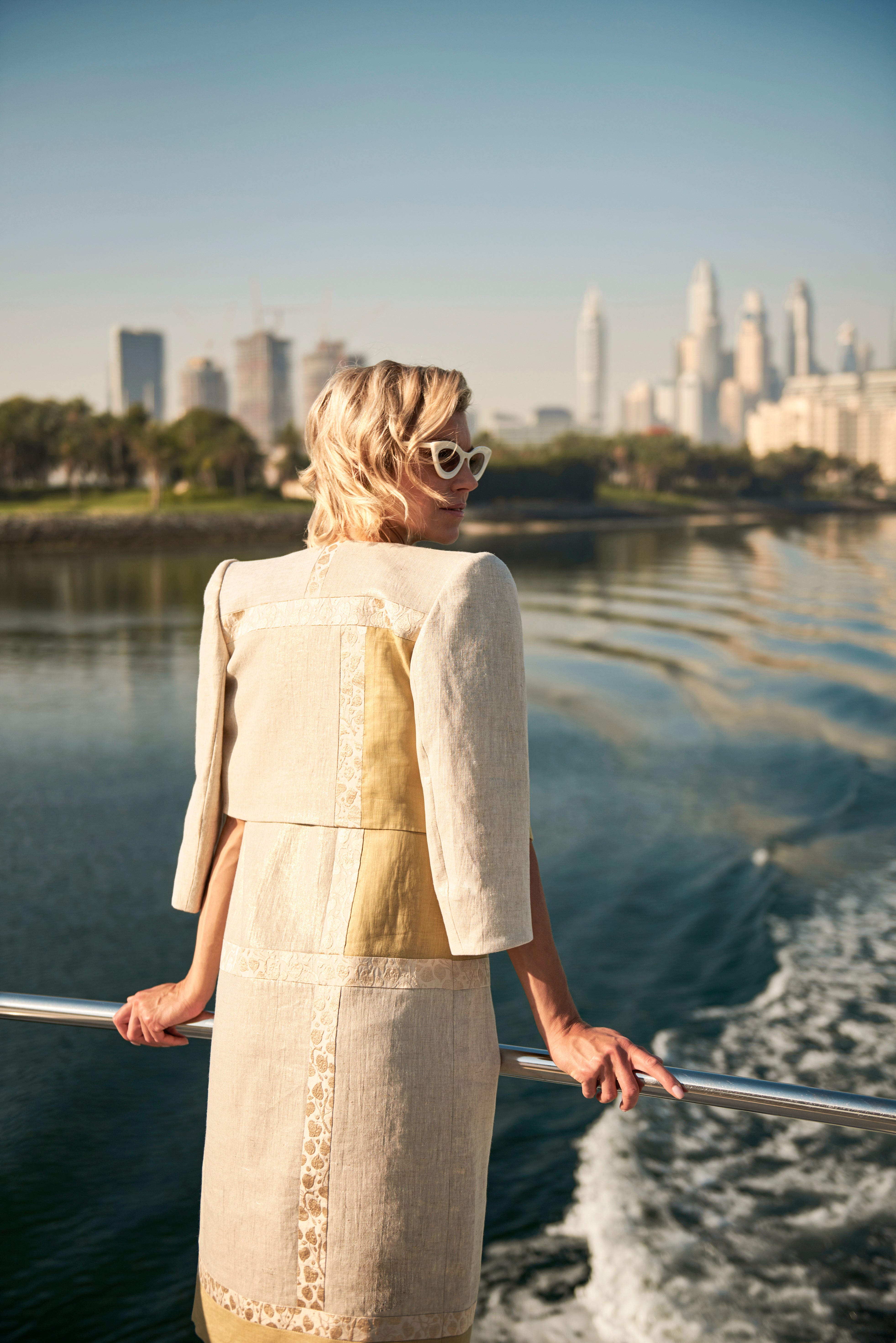 Two-piece linen ensemble inspired by Modigliani’s portraits. Straight-cut sleeveless dress and cropped collarless jacket in ivory linen with a soft golden sheen.