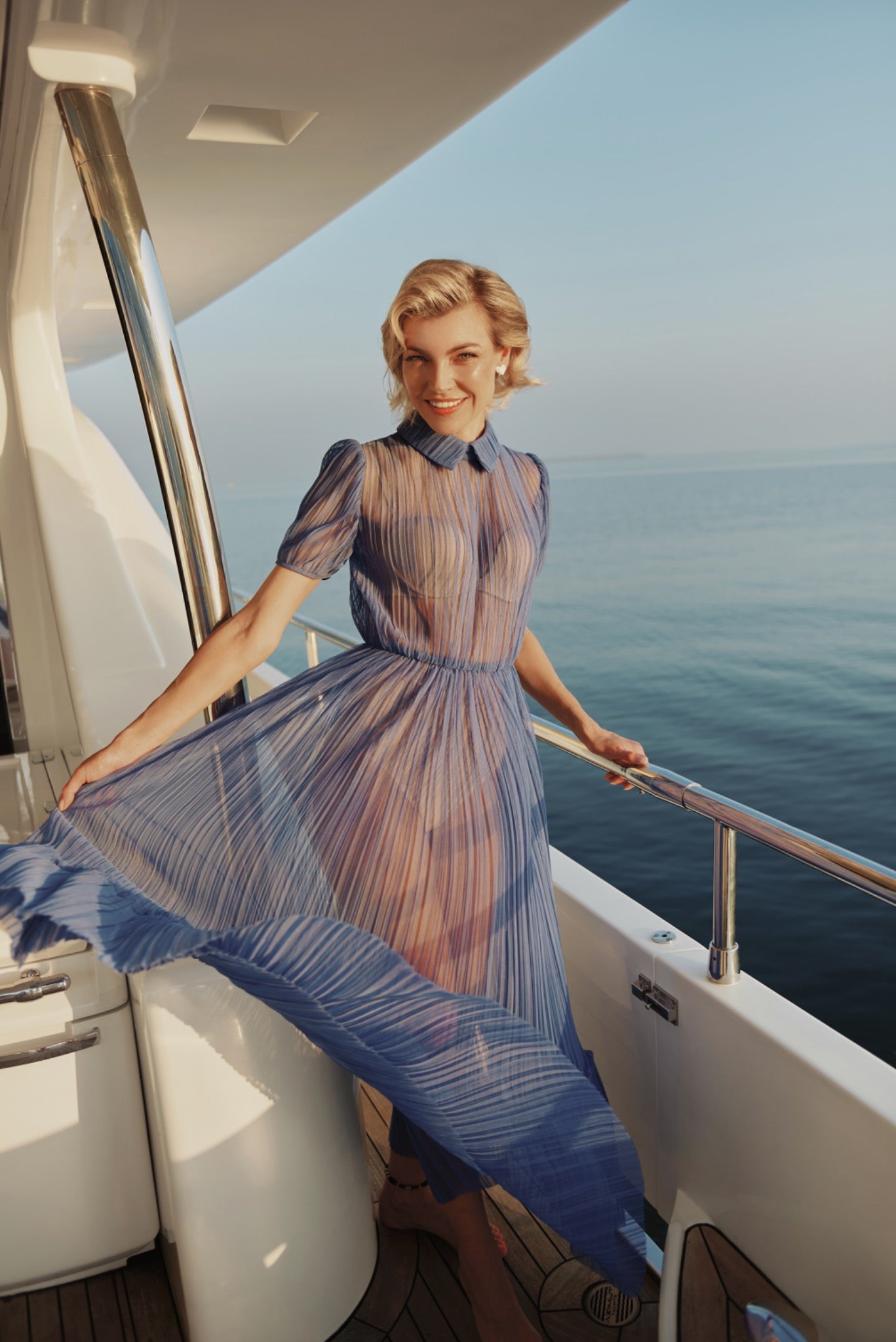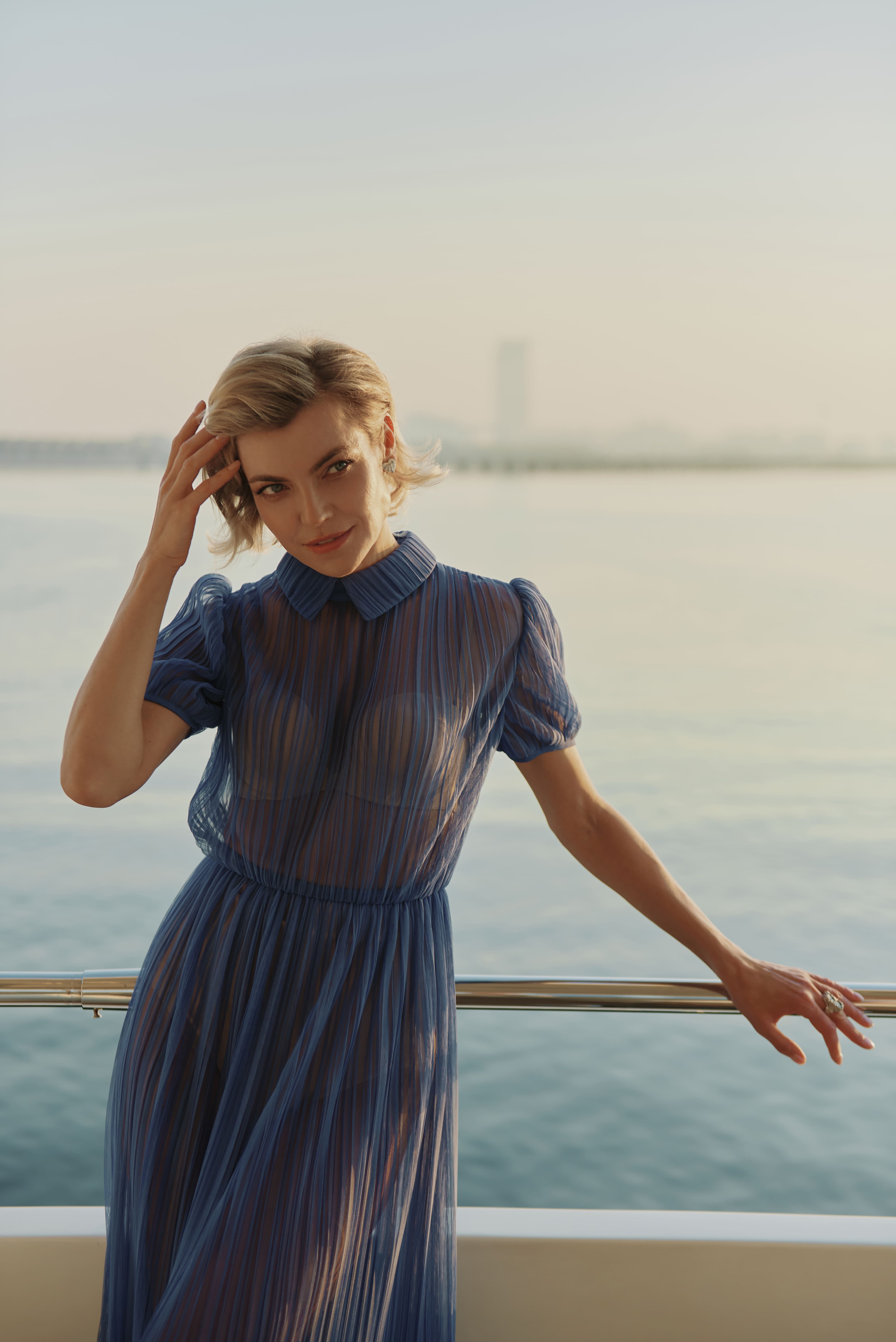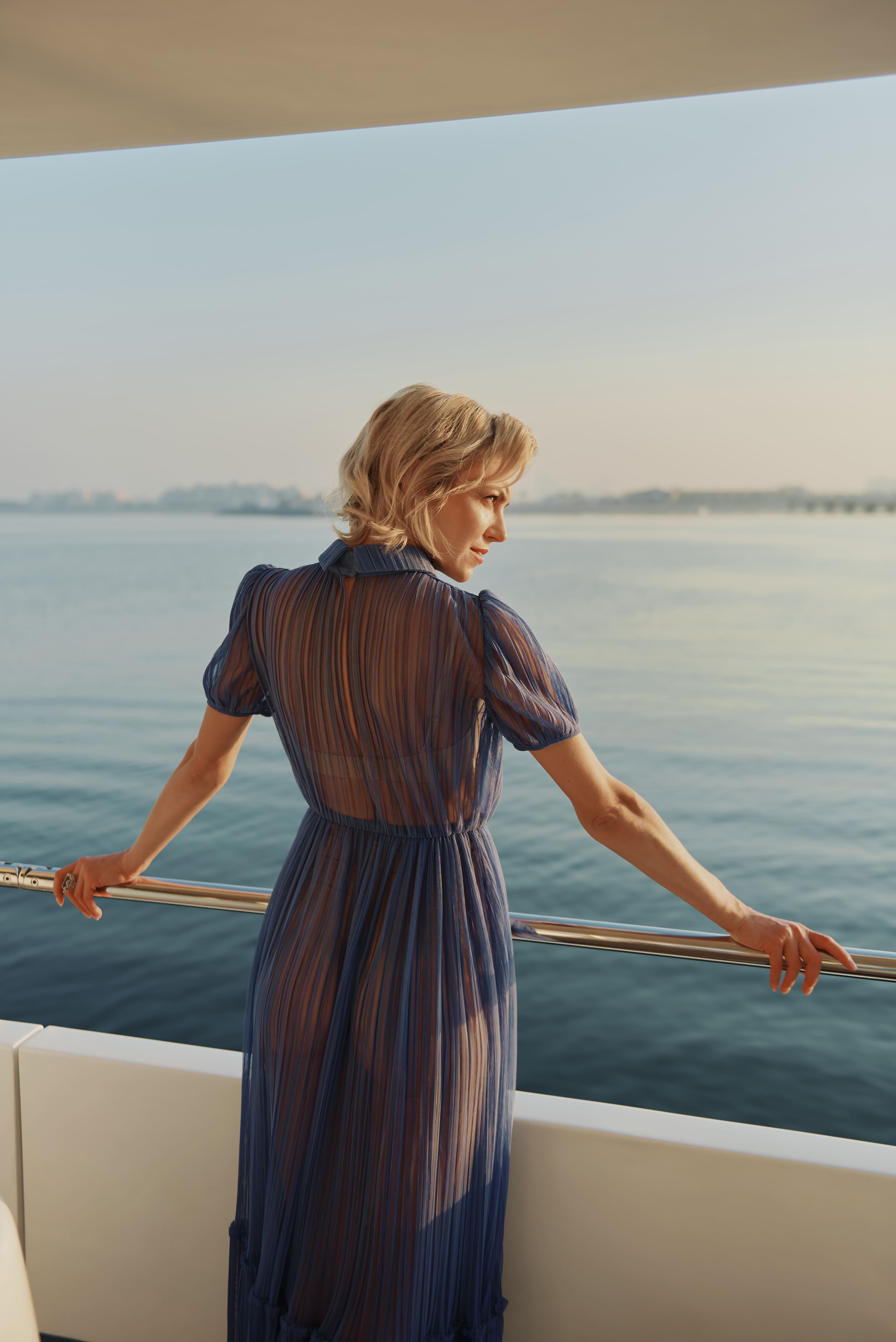 Transparent maxi dress inspired by the fashion of the late 1940s. Crafted from sheer plissé fabric with light texture and fluid movement. The dress is fitted at the waist and features a full-length, flowing skirt. Finished with puff sleeves and a structured collar with a back button closure — clean lines, defined shape, and strong visual presence.