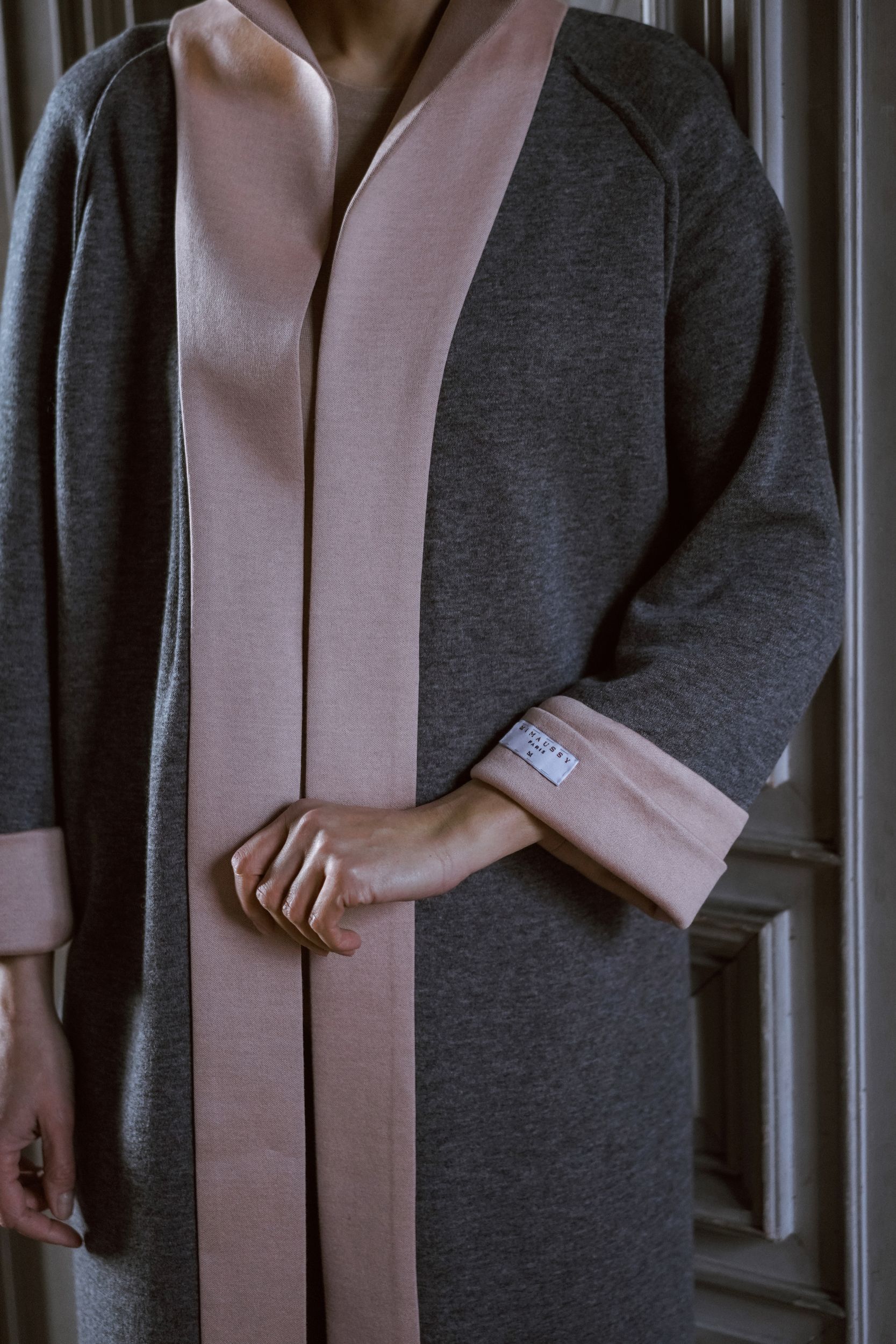 An elegant statement piece, designed to adapt to your mood and moment. This fully reversible wool coat reveals two faces: a delicate blush pink and a refined gray - two stories woven in one garment.