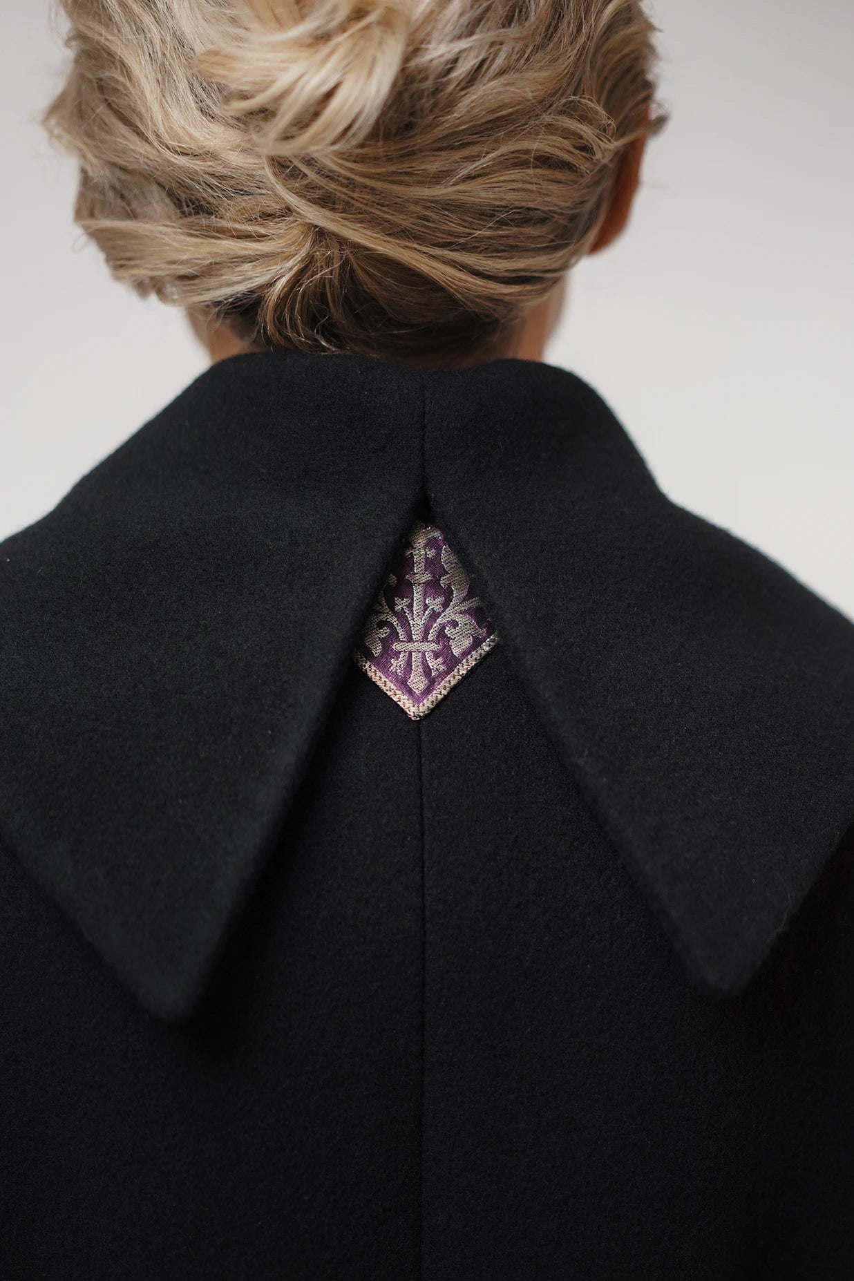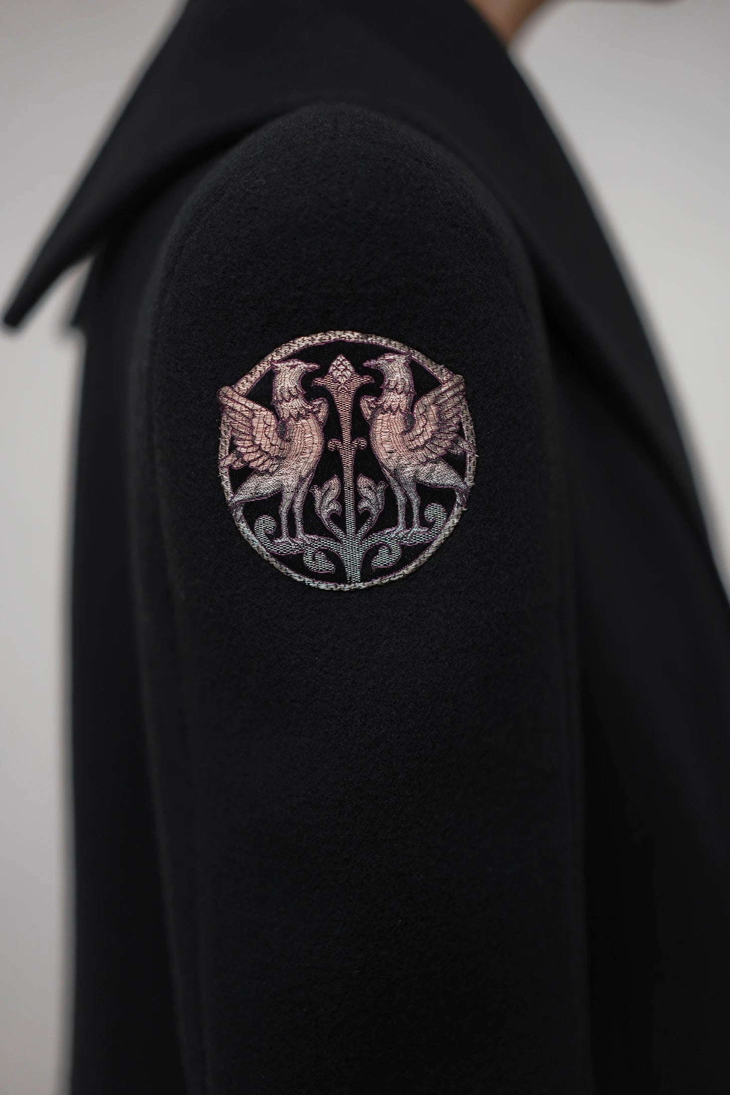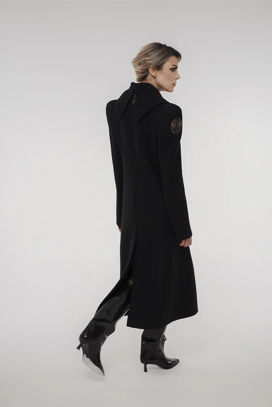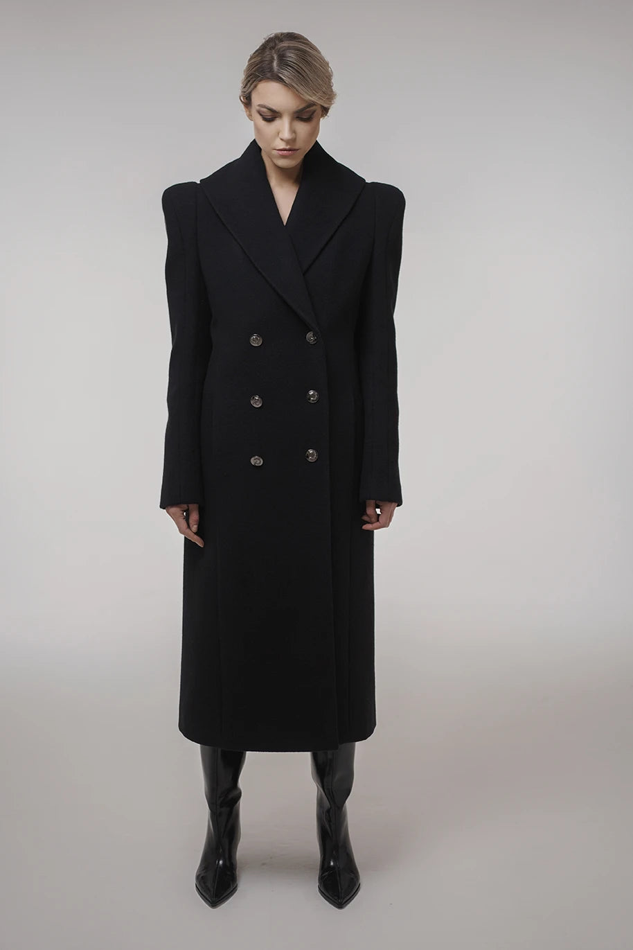 Sculpted in deep black wool, with shoulders rising like wings and a double-breasted cut that commands presence.