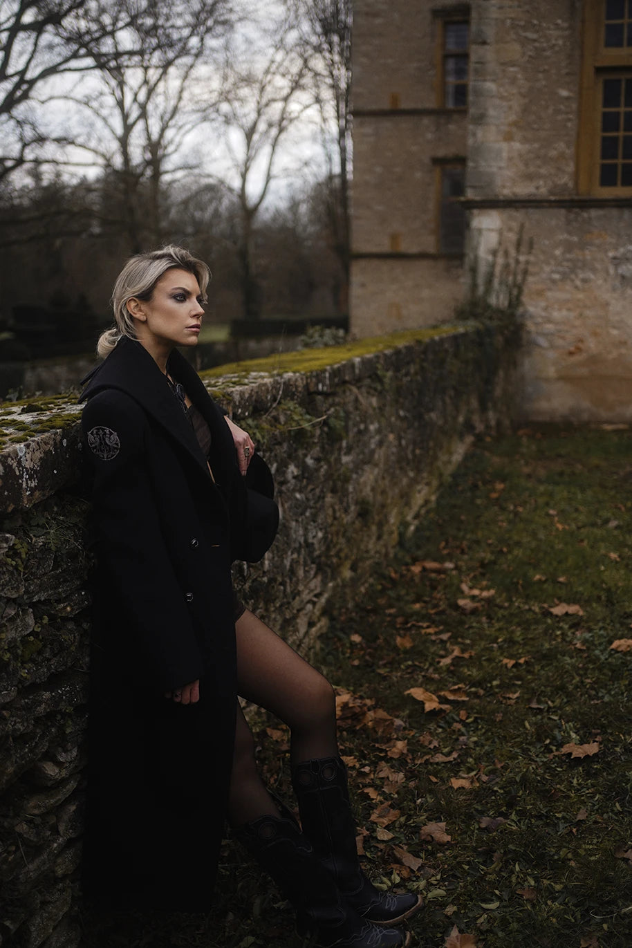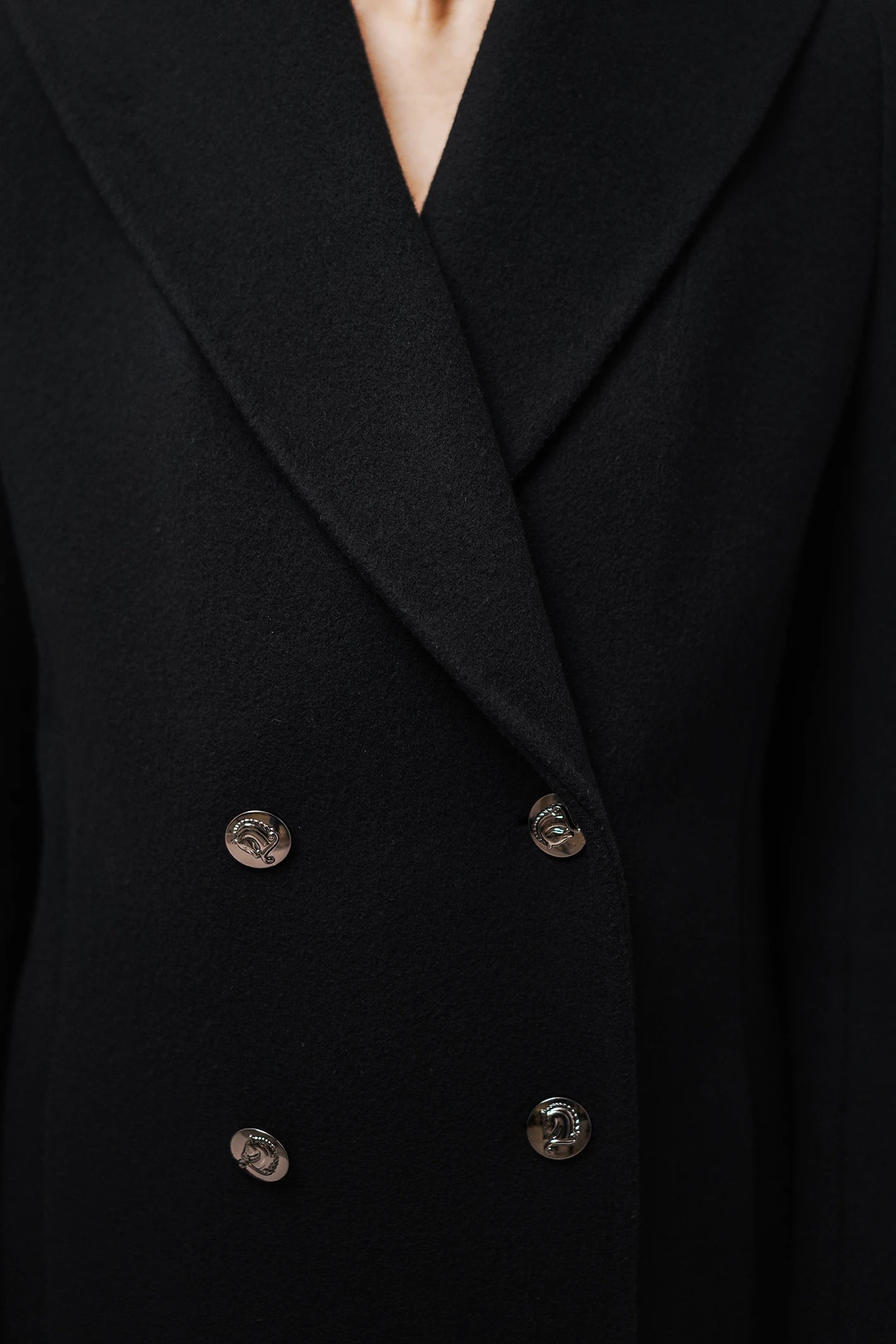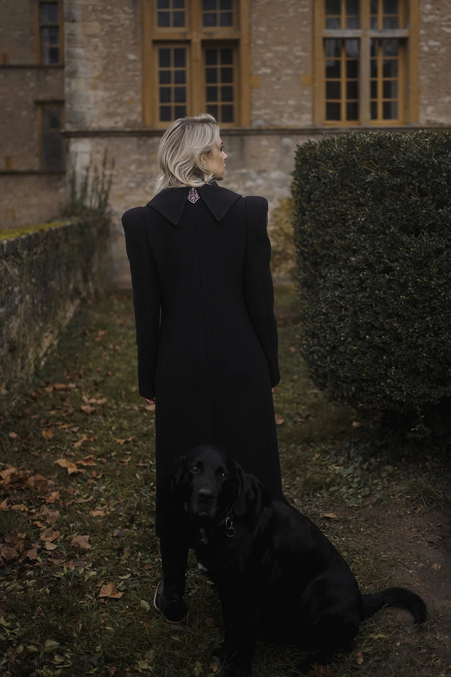 Sculpted in deep black wool, with shoulders rising like wings and a double-breasted cut that commands presence.