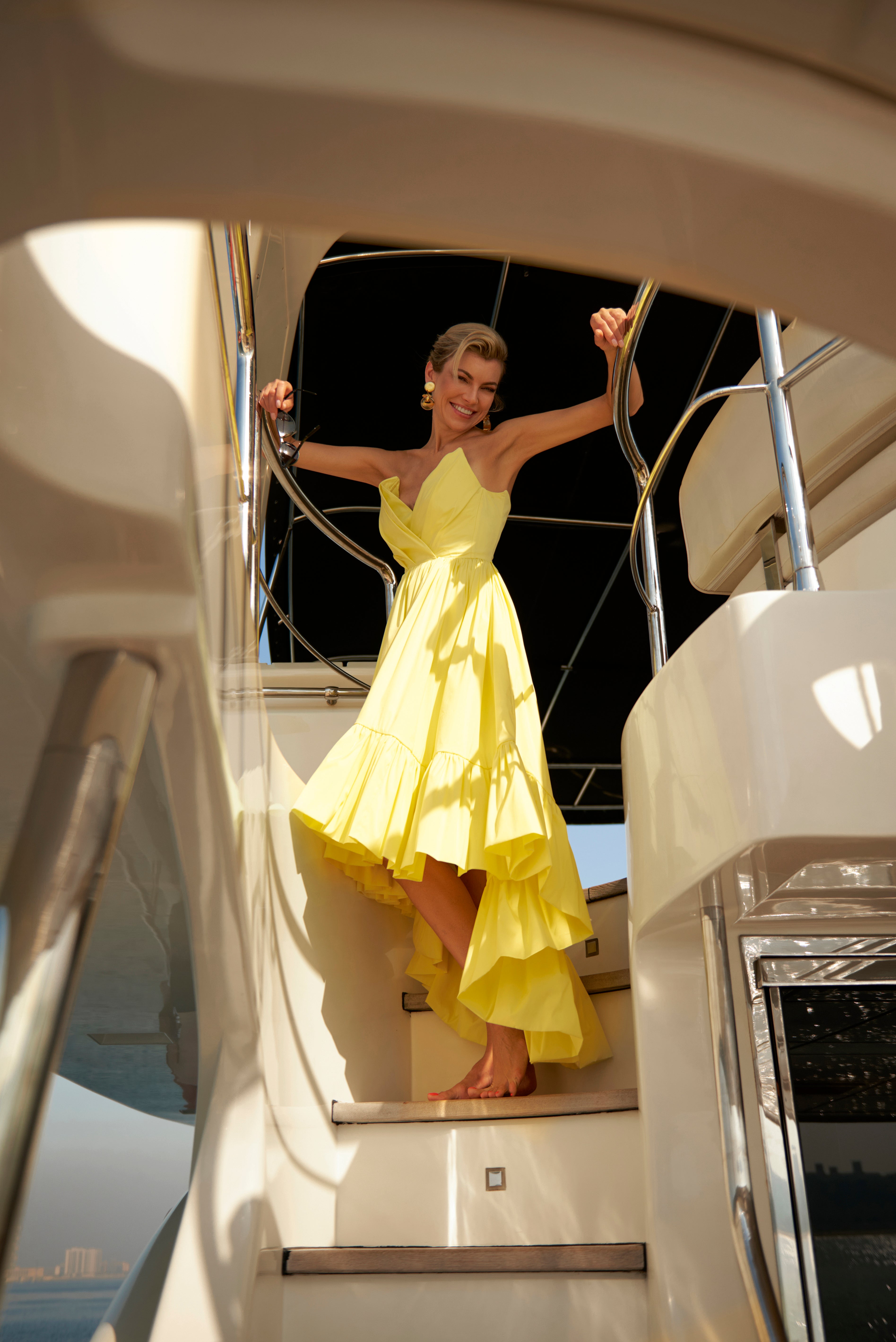 Сorset dress featuring a sculpted tulip-shaped bodice and a gathered skirt finished with a wide ruffled hem.